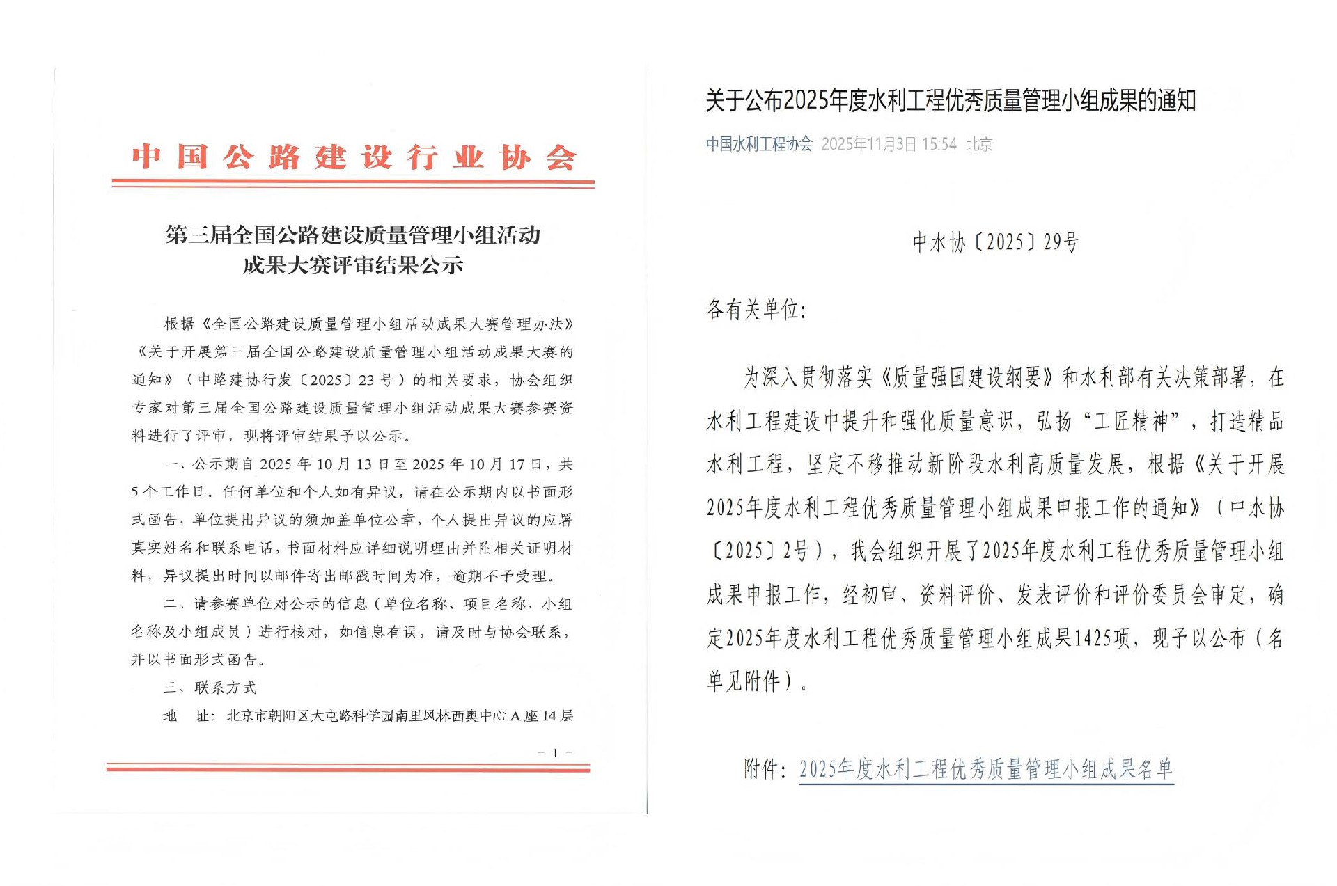 近日,中國公路建設(shè)行業(yè)協(xié)會(huì)、中國水利工程協(xié)會(huì)先后公布了第三屆全國公路建設(shè)質(zhì)量管理小組活動(dòng)成果評(píng)審結(jié)果和2025年度水利企業(yè)質(zhì)量管理小組競(jìng)賽活動(dòng)結(jié)果。“···